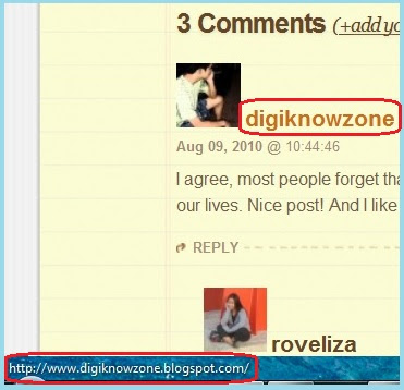 After posting a comment to a site, hover your mouse to the commentator's username. For this example, I've posted a comment in my friend's blog. You can see that there's a link showing the site I've included for my comment in the browser's status bar.